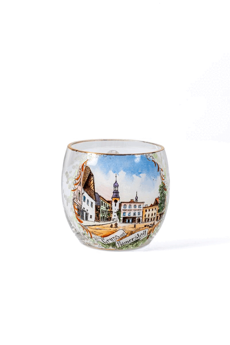 Skleněný hrníček (hrnek, hrneček) soudkového tvaru s nepravidelným dnem a ouškem kruhového profilu. Okraj je zdoben linkou, na oušku vertikální linka. Pochází z 80.-90. let 19. století, doplněn malbou severního rohu rýmařovského náměstí, nápis "Gruss aus / Römerstadt".